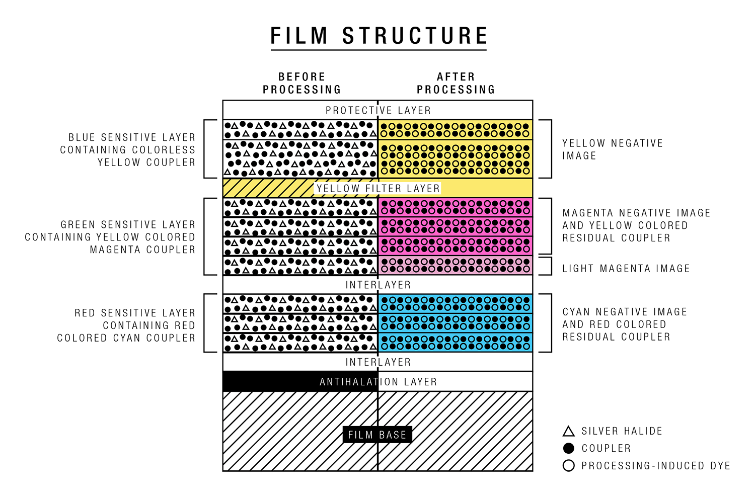 Photographic film is created by coating a transparent strip of plastic with a series of chemical layers that are sensitive to light. The combination and order of these layers is different for each type of film (color, black & white, slide, instant, etc). A lot of times you'll hear the word "emulsion" when referring to the chemical components of film. Emulsion is a scientific word for "mixture," and in most cases, when talking about photographic film, it is referring to those light-sensitive layers. These layers are made up of a gelatin emulsion containing microscopically small light-sensitive silver halide crystals. The sizes and varying characteristics of the crystals determine a film's sensitivity, contrast and resolution. When exposed to light, these crystals chemically change (with the change being proportional to the amount of light they are exposed to), which is what creates the imprinted image (often called "exposure") in the emulsion (chemical mixture) on the strip of film. This exposure can then be seen once the film is developed.
