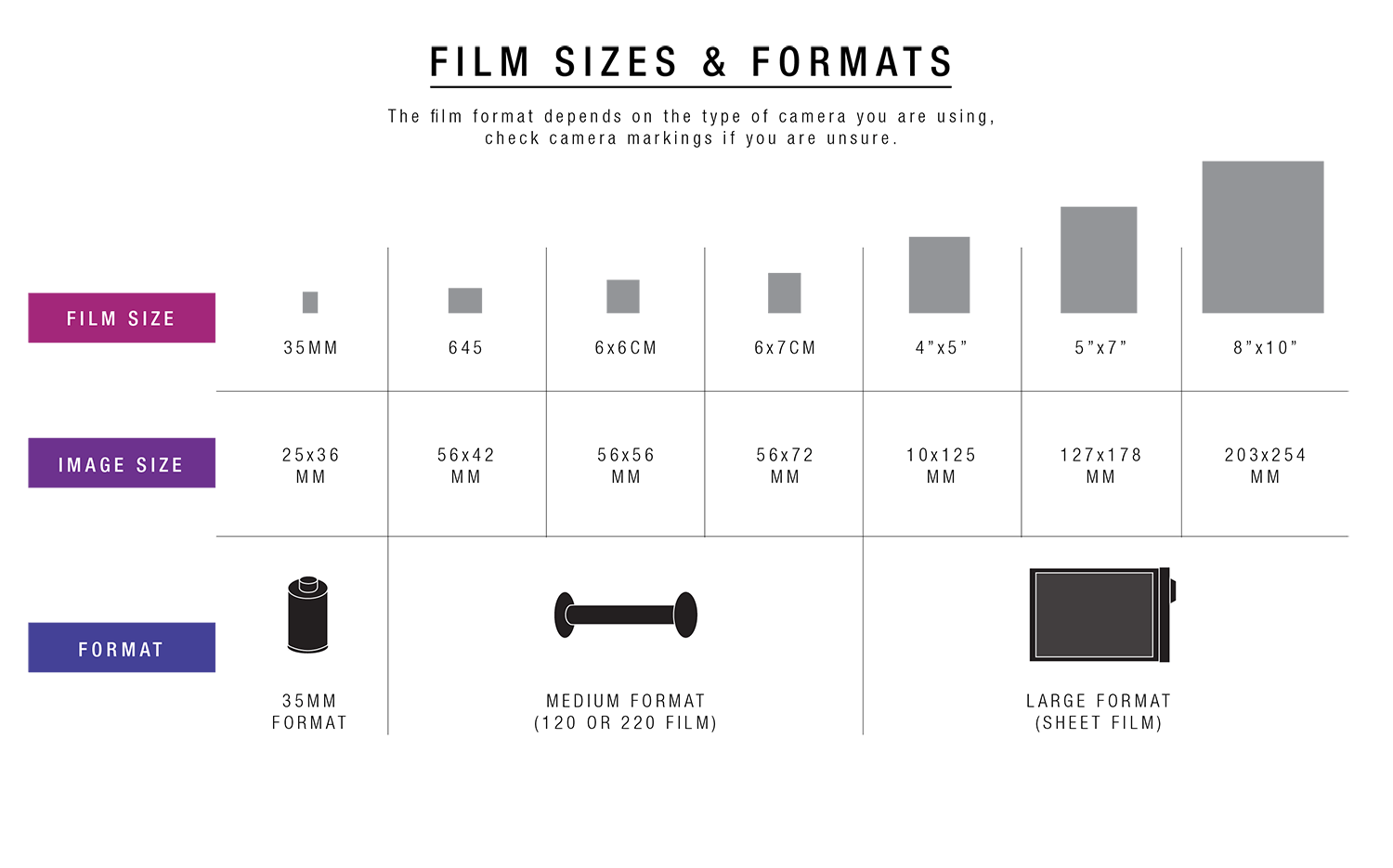 Large Format: Also known as Sheet Film, Large Format is any film with a single frame size of 4x5 inches or larger. This is often called Sheet Film because each frame is a separate sheet, not on a consecutive roll or spool like 135 and Medium Format films.