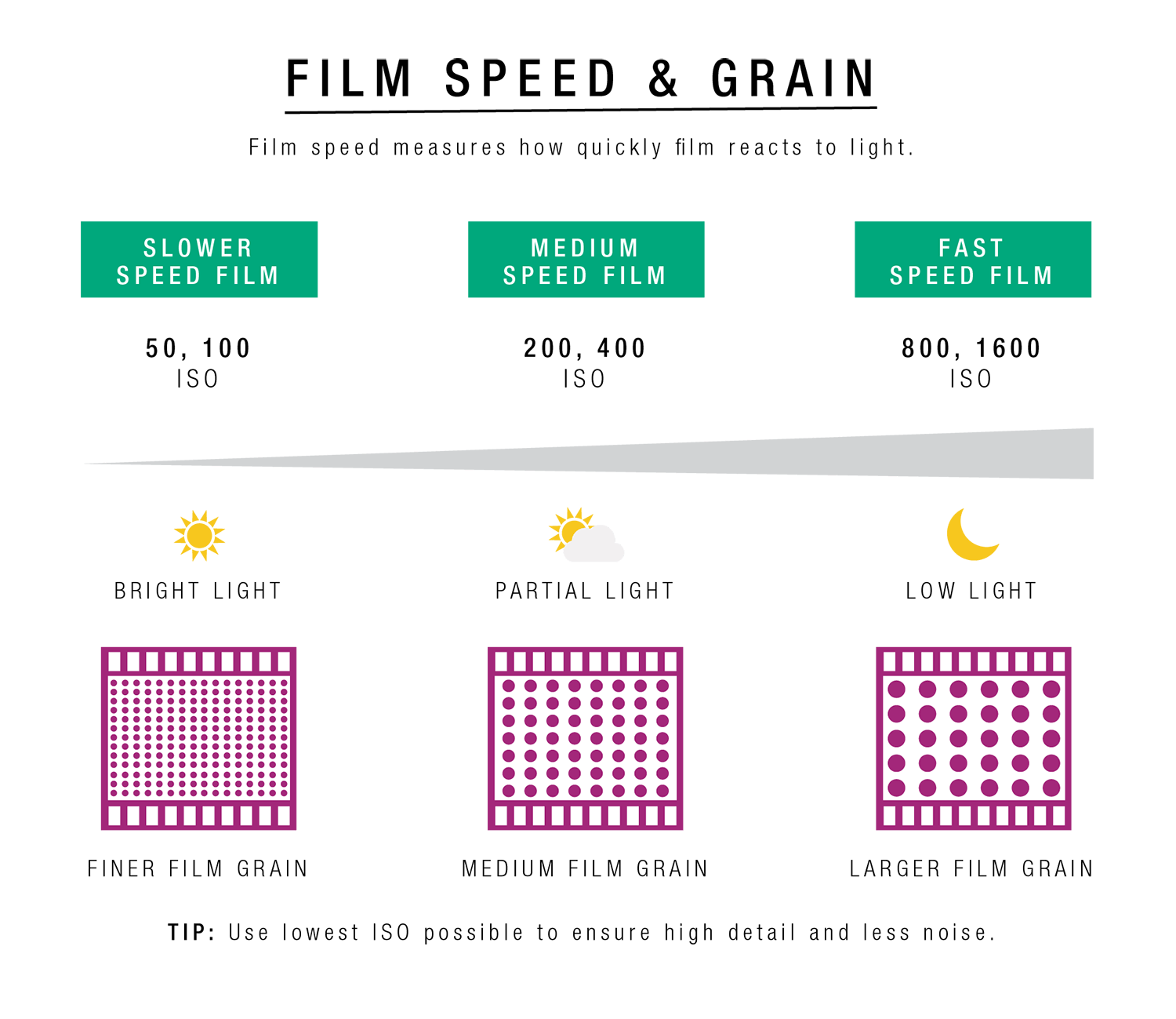 ISO is the measurement of a film's speed, defined by its sensitivity to light. The lower the film speed, the less sensitive to light and the finer the grain in the resulting image. The higher the film speed, the more sensitive to light and the larger the visible grain in the final image. Generally speaking, when shooting film, ISO will be the first variable you decide on before managing the rest of the Exposure Triangle to create the desired outcome in your final image.