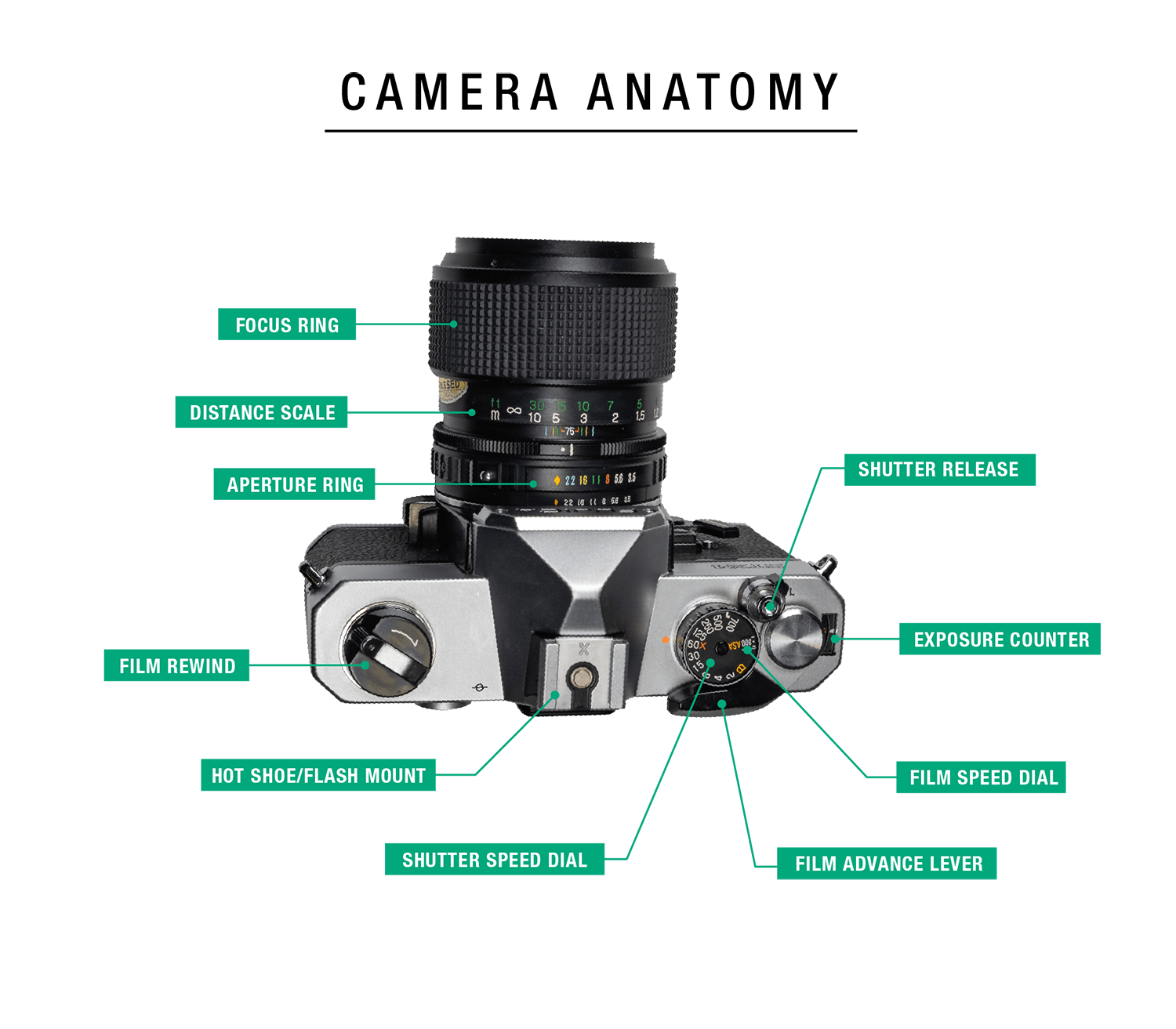 Most film cameras consist of six main components: