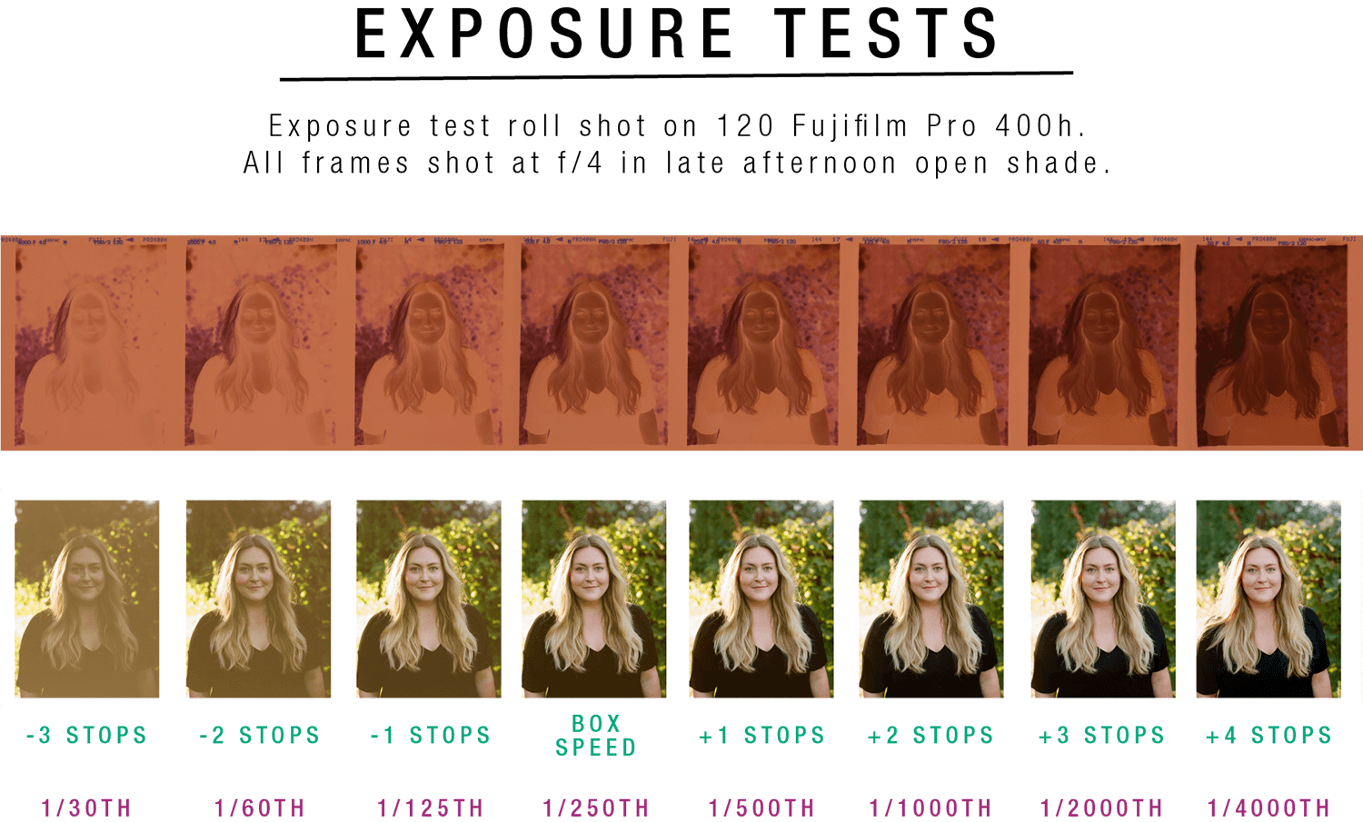 NOTE: Don't forget to communicate with your lab when you send in Bracketed Exposure Test roll. If they aren't aware that the roll was shot to test exposures, your professional lab may automatically try to compensate for the deliberately underexposed and overexposed negatives in the scanning process in order to "correct" the error as much as possible before delivering the digital scans.