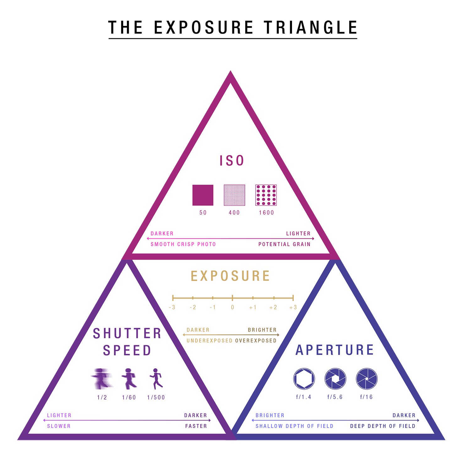 Aperture, Shutter Speed, and ISO work together to determine the exposure (overall lightness or darkness) and overall esthetic of a photograph. The "Exposure Triangle" is a way of demonstrating how these three variables work together in direct correlation to achieve your desired results when creating an image.